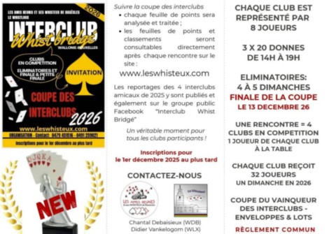 Si vous organisez un tournoi de whist ouvert à tous en Wallonie ou à Bruxelles, à titre privé ou associatif, vous pouvez nous envoyer toutes les informations ainsi que l'affiche numérique à
